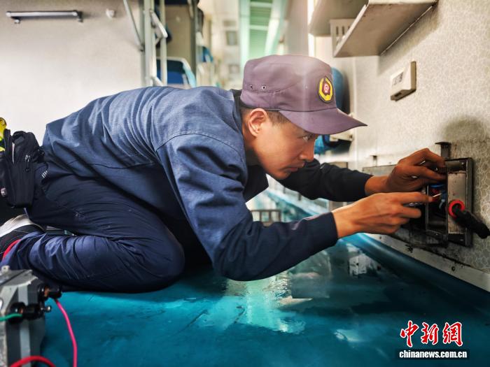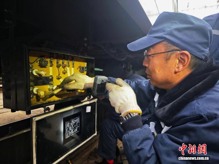 图为郑州车辆段检车员对于车上效劳办法电温器停止检验。 刘雨 摄