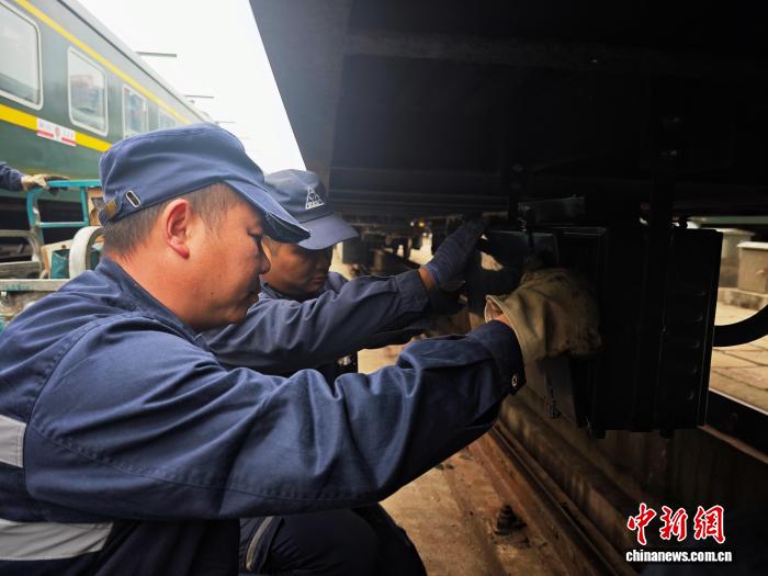 图为郑州车辆段检车员对于车停配件停止检验。 弛家瑞 摄